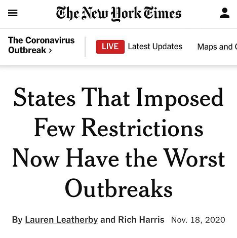 △《紐約時報》指出,目前中西部各州暴發疫情最為嚴重的地方,也正是實施疫情控制措施最少的地區