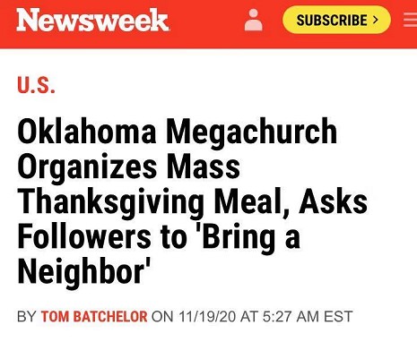 △《新聞週刊》指出,俄克拉荷馬州一教堂高調宣佈舉辦大規模感恩節大餐,並號召人們前去參加