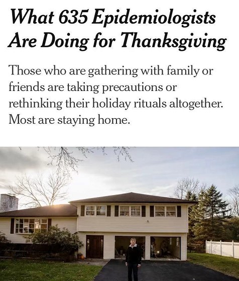不過,美國疾控中心再次敦促民眾避免旅行。為此,《紐約時報》對635名流行病專家進行了非正式調查,絕大多數人表示,安全起見,沒有計劃與朋友聚餐;79%的人表示,只准備與家人一起吃感恩節晚餐,或者完全不見面;僅有21%的人表示將與家人以外的人一起用餐。