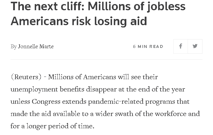 △路透社刊登文章:下一個懸崖:數百萬失業美國人可能失去救助