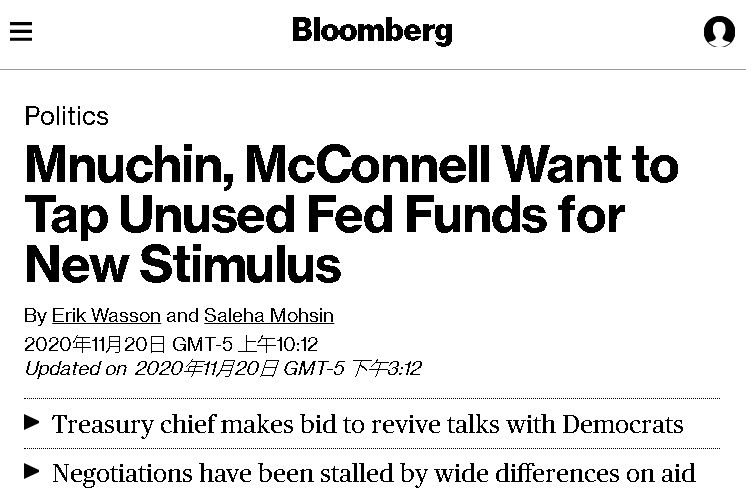 據彭博社報道,美國財政部長姆努欽正在重啓與國會民主黨人之間陷入僵局的紓困談判,他提議將未被利用的美聯儲救助資金作為新的援助計劃的一部分。姆努欽和參議院多數黨領袖麥康奈爾11月20日討論了這一策略,標誌着特朗普政府在大選後首次在紓困法案上有所行動。