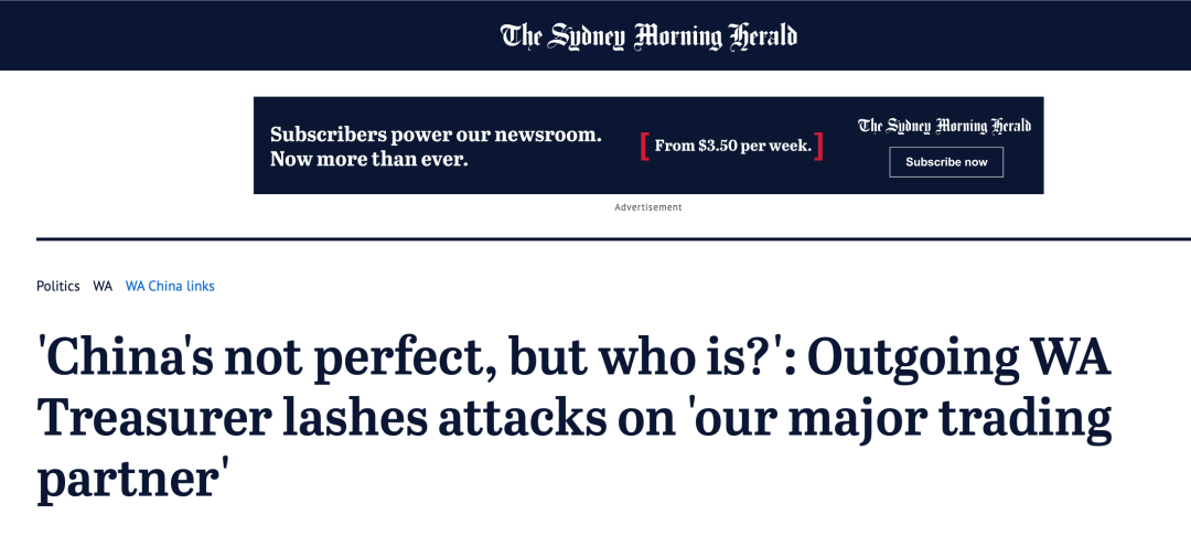 去年,西澳州政府跟聯邦議會情報與安全聯合委員會主席哈斯蒂就對華政策進行交鋒。麥戈文批評哈斯蒂,後者撰文稱西方對北京野心的應對無異於二戰期間盟軍防衞西歐時的誤判。麥戈文認為,這種言論對“我們與中國的關係非常不利”。西澳反對黨領袖麗莎·哈維週四説:“我們確實需要找到與中國問題的解決方案,因為他們是我們的重要貿易伙伴。因此,政府每個層級的每個人都應儘自己的力量去嘗試改善這種關係。”(作者納森·洪德羅斯等)