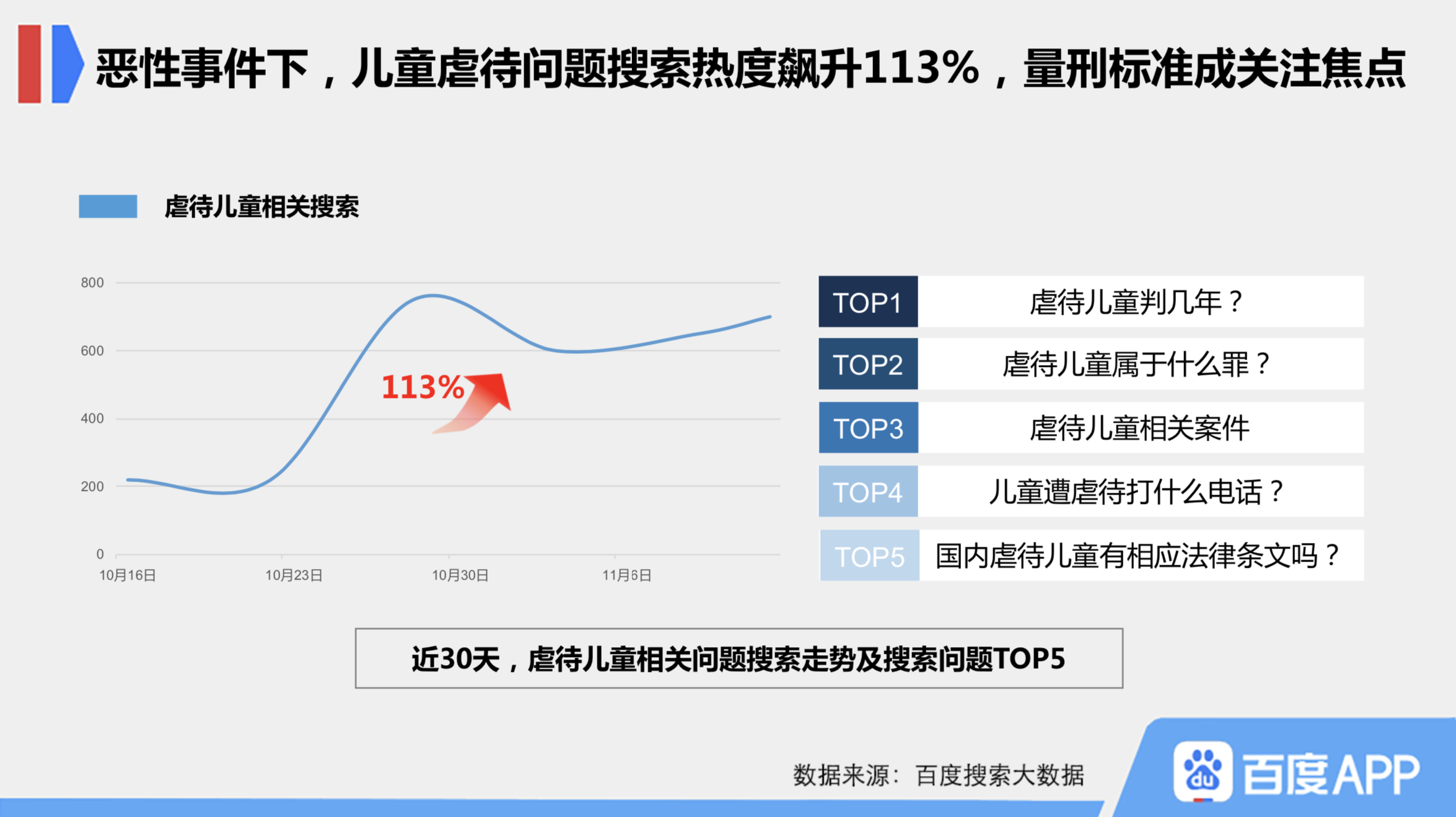 虐待兒童事件頻頻發生掀起輿論波瀾。百度搜索大數據顯示,近30天“虐待兒童”相關問題搜索熱度飆升113%,“虐待兒童判幾年”“虐待兒童屬於什麼罪”等量刑標準成為重要關注方向。