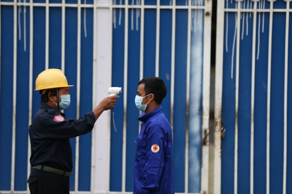 10月28日,在緬甸仰光的國家劇院維修改造項目現場,準備上班的覺泰昂接受體温測量。新華社發(吳昂攝)