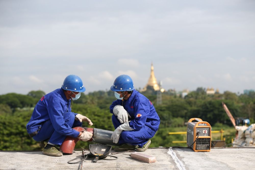 10月28日,在緬甸仰光的國家劇院維修改造項目現場,覺泰昂在師父的指導下焊接鋼管。新華社發(吳昂攝)