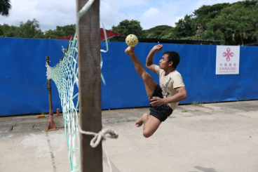 10月28日,在緬甸仰光的國家劇院維修改造項目現場,覺泰昂在休息時間和工友踢藤球。新華社發(吳昂攝)