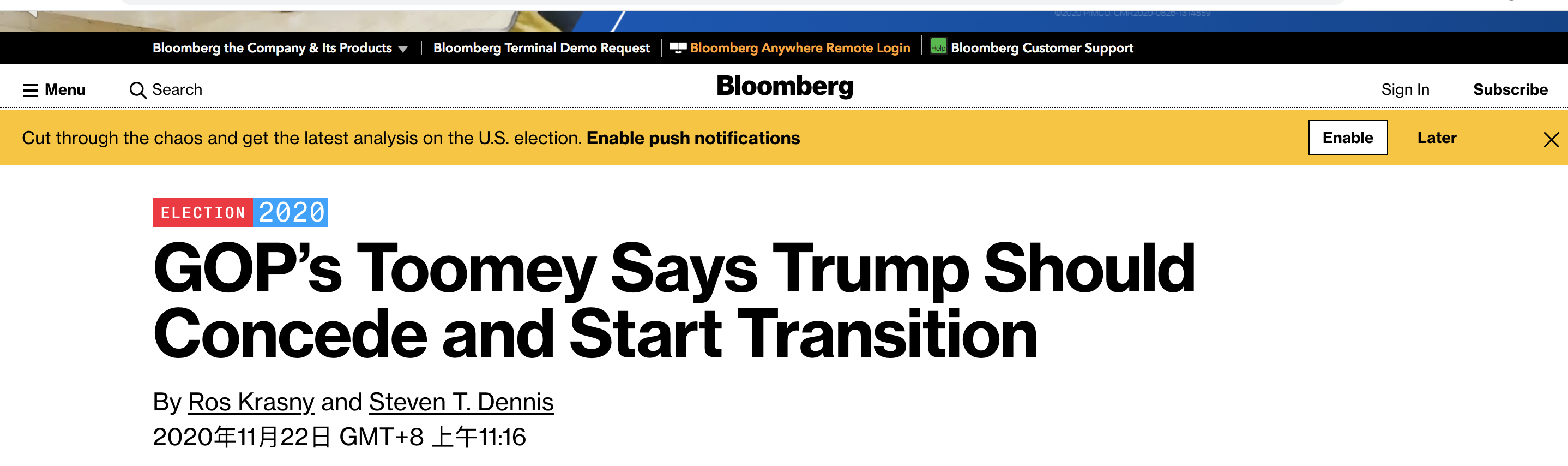 共和黨籍參議員:特朗普在賓夕法尼亞州已用盡法律途徑,該承認拜登勝選了