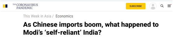 《南華早報》22日文章表示,在該運動宣佈的幾個月後,中國不僅仍是印度最大的貿易伙伴和進口來源國,而且根據印度政府的最新數據,在截至9月份的6個月裏,中國在印度進口總額中所佔的份額已從上一財年的13.7%升至18.3%。