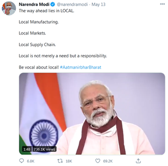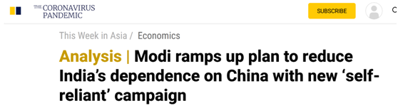莫迪此前在5月份曾提出“自立更生(self-reliant)”運動。據《南華早報》5月的一篇報道,在5月12日,莫迪宣佈了一項價值2650億美元(約佔GDP的10%)的刺激計劃,以重振遭受重創的印度經濟。莫迪稱這是推動印度“自力更生”(運動)努力的一部分。但文章稱,分析師和實業家懷疑其聲明是否能轉化為行動。