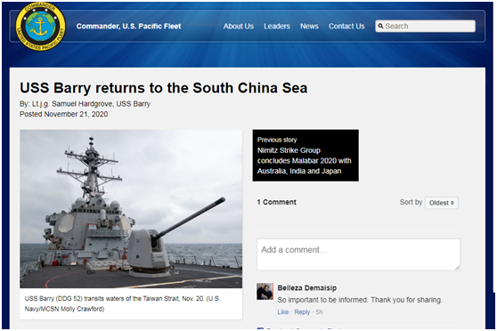 據報道,北京時間22日,美國海軍在其官網宣佈了所謂“美國海軍巴里號重返南海”的消息,宣稱該艦將在該地區“促進和平及穩定”。↓