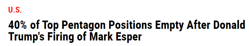 參議院軍事委員會前高官阿諾德·普納羅稱,考慮到新一屆政府即將上任,而參議院僅剩14個工作日,特朗普給這些職位的提名人選將很難得到確認。普納羅稱,現政府提名和任命人選的速度明顯要慢於往屆。
