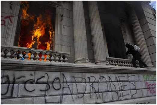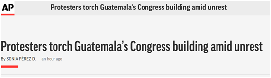 據美聯社報道,當天,數百名示威者闖入危地馬拉國會大樓並縱火。與此同時,危地馬拉總統府外,約有1萬名示威者也在舉行抗議活動,以反對該國政府批准預算中削減教育、衞生等支出一事。
