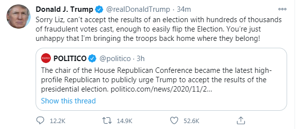 特朗普轉發的這則新聞中,“政客”寫道:眾議院共和黨會議主席利茲·切尼成為最新一位公開敦促特朗普接受總統選舉結果的共和黨人。