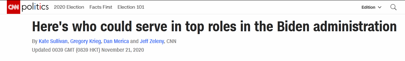 在一篇題為《可能在拜登政府中擔任高級職務的人》的報道中,CNN表示,“當選總統”拜登將在未來幾天和幾周內宣佈誰將在他的政府中擔任高級職位。在這篇報道中,CNN提到楊安澤可能出任商務部長一職。