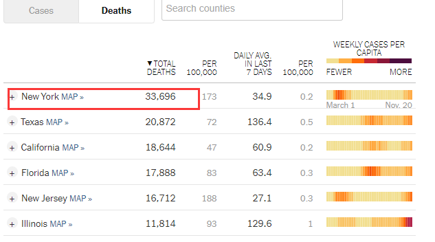 圖為《紐約時報》給出的紐約州因新冠肺炎死亡人數的數據
