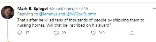 因此,他拿獎的事情在美國的網絡上也引起了強烈的爭議。在美國社交網站推特上,不少網民就質問他憑什麼能在紐約州死了數萬人後還能拿這麼一個獎,認為這個獎是在吃死者的人血饅頭。