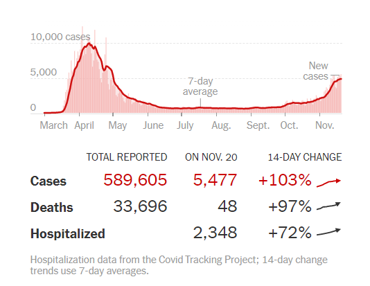 從《紐約時報》給出的紐約州的疫情曲線圖來看,紐約曾在4、5月份經歷了極為嚴重的疫情爆發,日新增病例一度逼近1萬一天。入夏後,當地疫情一度趨向平緩。可自11月以來,當地的疫情又出現了明顯的反彈——其中僅11月20日一天當地就新增了5477個新的感染病例和48個死亡病例。