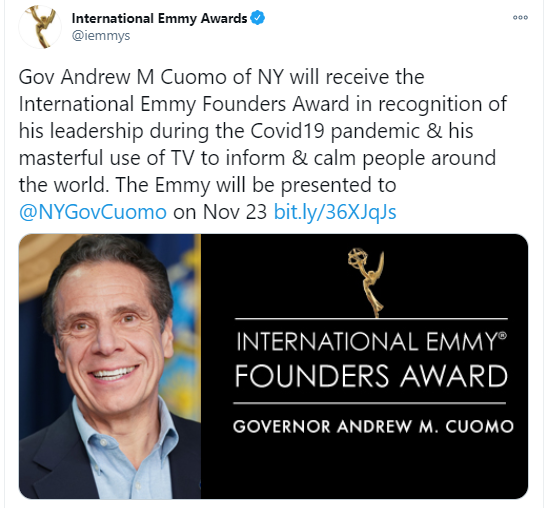 21日,由美國“國際電視藝術與科學學院”主辦的“國際艾美獎”方面宣佈,他們將把2020年度的一項大獎頒發給美國紐約州的州長安德魯·科莫,以表彰他在新冠疫情中做出的一項貢獻。