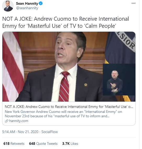 其中,看科莫這位民主黨籍的州長不爽的美國共和黨人士,更在藉此事狠批他,稱他拿獎這事太魔幻了。
