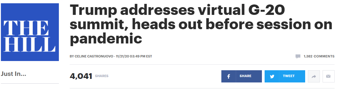 不過,報道稱,在峯會開始後不久,特朗普就開始在推特上發消息,內容與G20峯會無關,而是關於選舉。
