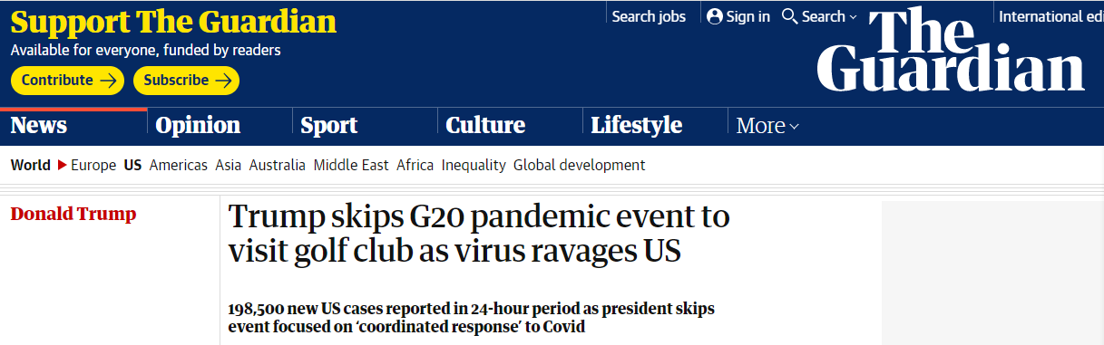 對此,《衞報》這樣寫道:特朗普跳過了G20峯會的“疫情防範”討論環節,而去了他的一家高爾夫俱樂部,與此同時,美國24小時內新增新冠確診病例多達19.85萬例。