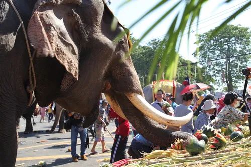 大象巡遊結束後,主辦方在市中心安排了一張巨大的自助餐枱,擺滿西瓜、甘蔗、菠蘿、黃瓜等大象最愛吃的水果,讓大象們能夠在這一天大飽口福,盡情享受屬於它們的節日。