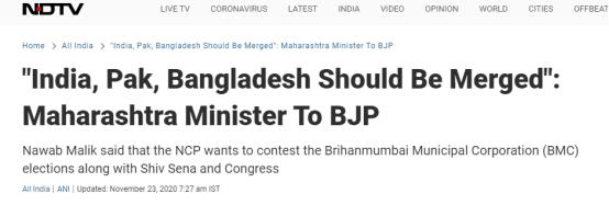 “德文德拉(前馬哈拉施特拉邦首席部長)曾説過,(巴基斯坦城市)卡拉奇成為印度一部分的那天終將到來。”馬利克説道,“我們一直在説印度、巴基斯坦和孟加拉國應該合併。如果柏林牆可以拆除,那麼為什麼印度、巴基斯坦和孟加拉國不能合併呢?如果(印度)人民黨希望將這三個國家合併為一個國家,我們一定會歡迎這一舉動。”