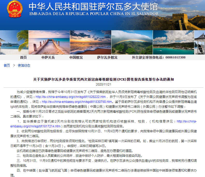 中國駐薩爾瓦多使館通知赴華乘客須憑兩次核酸陰性報告乘機