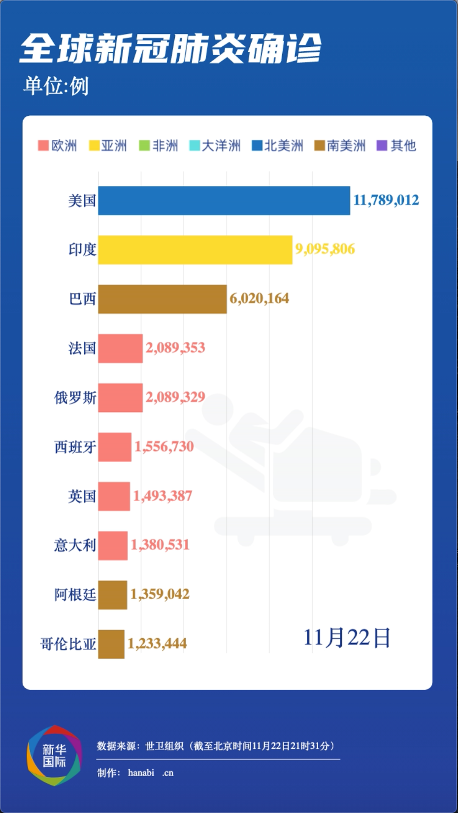 世界衞生組織:截至歐洲中部時間22日14時31分(北京時間21時31分),全球確診病例較前一日增加604943例,達到57882183例;死亡病例增加9237例,達到1377395例。