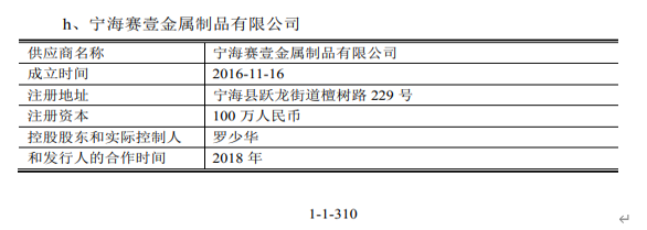 此外,寧波方正的監事會主席孫小明先生,在2017年1月註冊成立過“寧海縣孫小明模具加工廠”,註冊地址為“寧海縣躍龍街道檀樹路 227號”,後於2018年4月註銷;而招股書披露,寧波方正的供應商之一、成立於2016年11月的“寧海賽壹金屬製品有限公司”,註冊地址為“寧海縣躍龍街道檀樹路 229 號”,截止到2019年末的實繳資本、員工社保繳納人數均為零,該公司於2018年也即“寧海縣孫小明模具加工廠”註銷當年成為寧波方正的供應商。