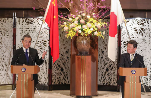 王毅説,新形勢下,中方願與日方一道,以更加寬闊的視野、更加有效的行動、在更加廣泛的領域,共同肩負責任,積極推進合作,讓中日關係更好惠及兩國人民和國際社會。