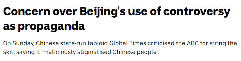 至於澳大利亞廣播公司方面,他們先是在報道中寫到:雖然有華人覺得這個節目不合適,但也有華人覺得這個節目沒啥問題,而且很多華人也不認為這個節目本意是為了冒犯華人,只是在開玩笑,只是時機不對。