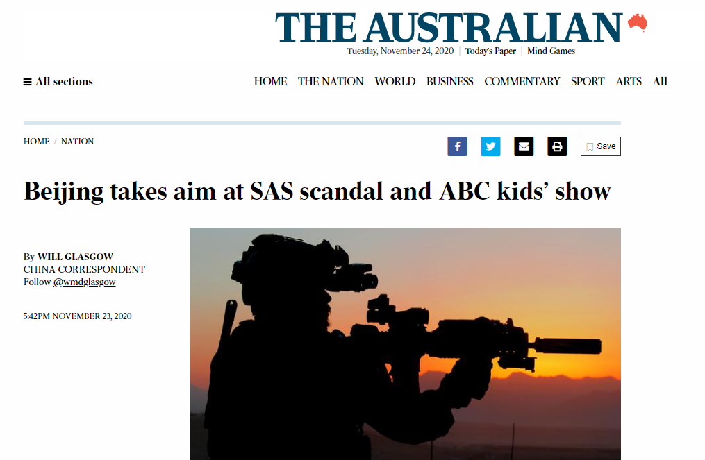 如下圖所示,《澳大利亞人報》直接就在標題中寫到:北京瞄準了澳廣的兒童節目以及澳大利亞士兵濫殺阿富汗人的醜聞。