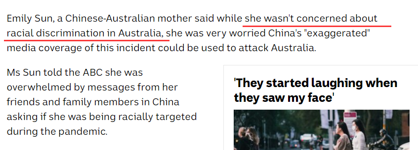 然後,這家引起此次華人羣體不滿的澳媒,就又把那個説中國媒體報道此事是“煽動反澳情緒”的“華裔母親”給搬了出來,引用她的話説她“並不擔心澳大利亞存在的種族主義問題”,反而認為這都是中國媒體“誇大”出來的。