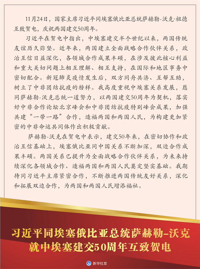 新華社北京11月24日電 11月24日,國家主席習近平同埃塞俄比亞總統薩赫勒-沃克·祖德互致賀電,慶祝兩國建交50週年。