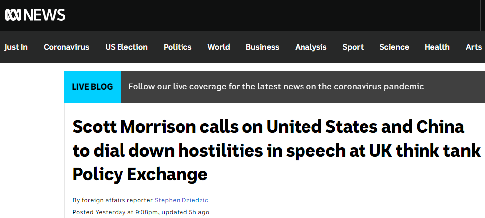 對此,ABC表示,莫里森的講話將被視為對特朗普政府針對中國最尖鋭論戰的否定。ABC認為,莫里森試圖恢復澳大利亞與北京之間日益惡化的關係。