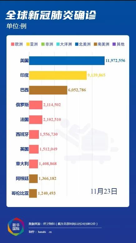 美國約翰斯·霍普金斯大學:截至北京時間24日7時26分,全球新冠確診病例達59070488例,死亡病例為1394694例。美國是全球疫情最嚴重的國家,確診病例達12395660例,死亡病例為257549例。
