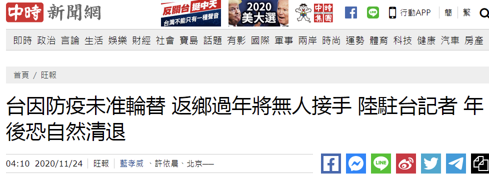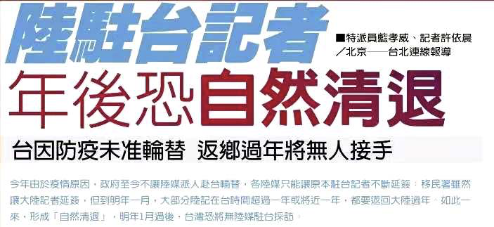 綜合《旺報》多篇報道,今年因疫情原因,民進黨當局至今不讓大陸媒體派人赴台輪替,各大陸媒體只能讓原本駐台記者不斷延籤,台灣“移民署”雖然讓大陸記者延籤,但大部分大陸記者明年1月要返回大陸過年。如此一來,有可能形成“自然清退”,即明年1月過後,台灣恐將無大陸媒體駐台採訪。