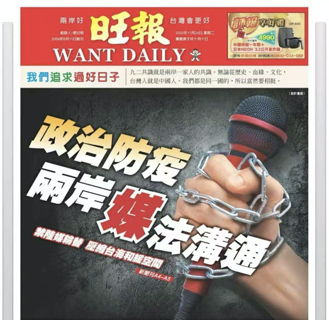 【環球網報道 記者 尹豔輝】“政治防疫,兩岸媒法溝通”,24日,台灣《旺報》在封面刊登以此為題的一組文章,批評蔡英文當局以防疫為藉口,暗地裏給大陸駐台媒體穿小鞋,有可能導致明年過年後形成大陸媒體駐台記者“自然清退”的局面。《旺報》批評蔡英文當局此舉是“政治防疫仇中,毀兩岸安全閥”,該報還質問,如果大陸也逼台媒撤點,“誰來為台灣發聲?”