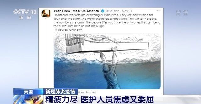 紐約一位急診醫生齊翁也在社交媒體上勸説美國人戴口罩,他發出了一則漫畫,漫畫中一名醫護人員浸在水中,卻仍全力將手中的病牀推舉到水面之上。齊翁寫道,“醫護人員正在被淹沒、精疲力盡。他們為大家拉響警報,卻遭到中傷,沒有歡呼聲、沒有掌聲、沒有感激。而這個冬天與假期,數字在可怕地增長。你們是唯一能扭轉局面的人。請幫幫我們,戴上口罩吧!”
