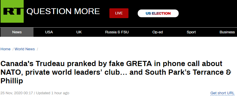 RT:加拿大特魯多在電話中被假冒“格蕾塔”的人戲弄,他們談到了北約、私人領導人俱樂部和加拿大喜劇二人組特倫斯和菲利普