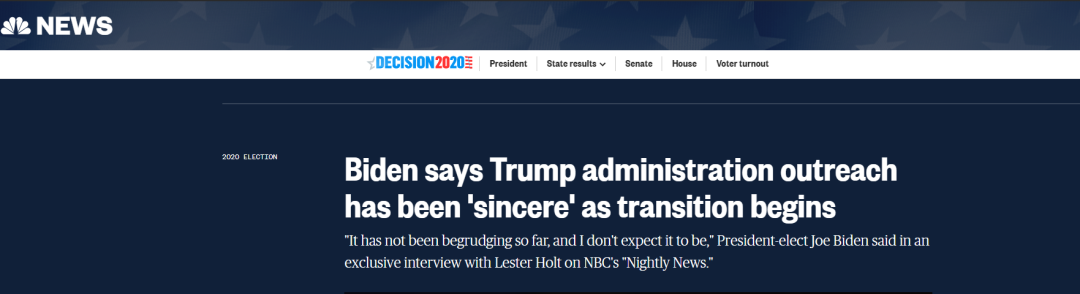 據美國全國廣播公司(NBC)消息,拜登在接受該媒體專訪中表示,特朗普政府已經開始為其(政權)交接團隊的工作提供幫助,並且特朗普政府在此過程中態度“真誠”。