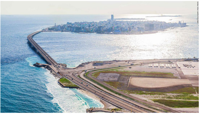 文章稱,在印度洋的中心,2.1公里長的中馬友誼大橋從一個田園詩般的環礁上蜿蜒而出,連接着馬爾代夫首都馬累和它的國際機場。