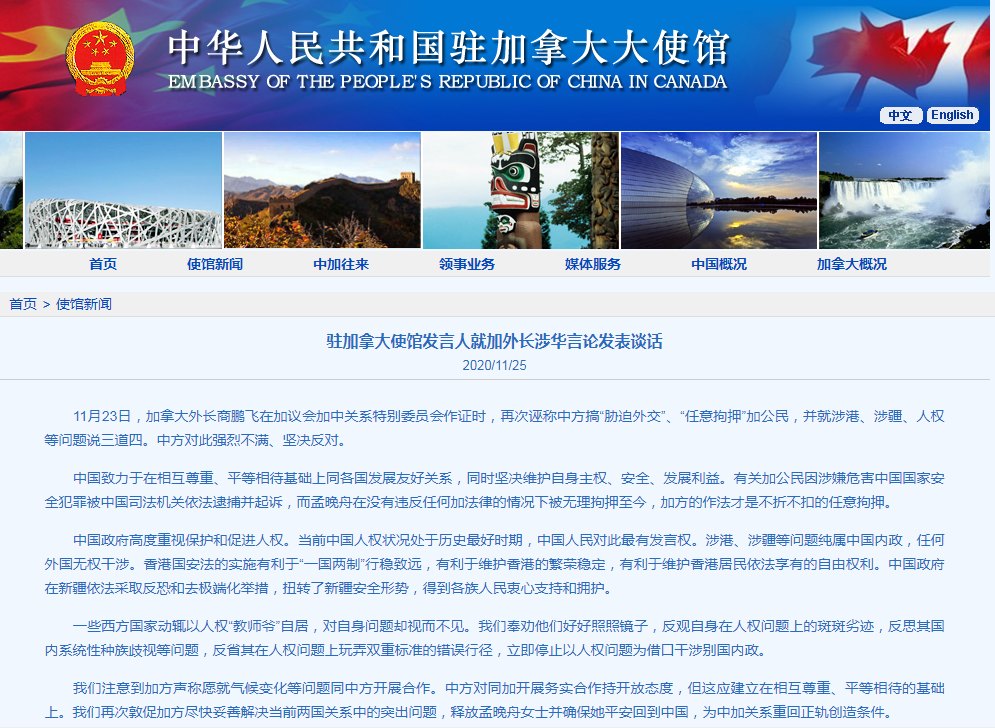 中國致力於在相互尊重、平等相待基礎上同各國發展友好關係,同時堅決維護自身主權、安全、發展利益。有關加公民因涉嫌危害中國國家安全犯罪被中國司法機關依法逮捕並起訴,而孟晚舟在沒有違反任何加法律的情況下被無理拘押至今,加方的作法才是不折不扣的任意拘押。