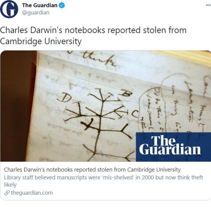 達爾文珍貴筆記本或已遭竊!內含關於進化論筆記