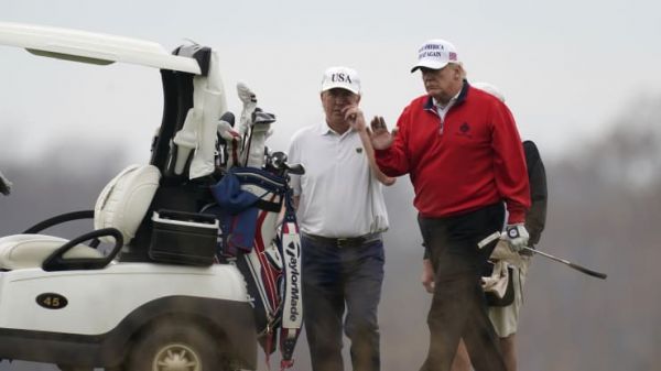 特朗普(右)21日在G20視頻峯會短暫露面後到弗吉尼亞州斯特靈打高爾夫球(美聯社)