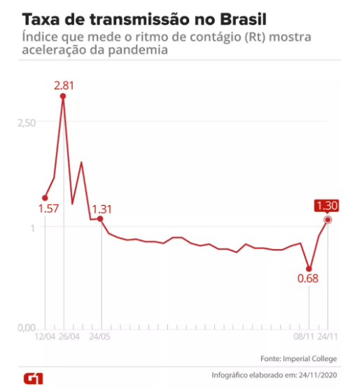 英國帝國理工學院於同日發佈研究報告稱,目前巴西新冠病毒基本傳染數(R0)達到了自5月份以來的最高值,為1.3,表示病毒傳播勢頭強勁,疫情呈現惡化趨勢。此前巴西新冠病毒基本傳染數已連續5周低於1,在8月11日達到自開始統計該數據以來的最低值0.68。在實際防疫過程中,疫情是否可以得到控制,取決於基本傳染數是否可以持續小於1。但專家提醒,近期疫情數據更新滯後,或影響該數據統計的準確度。
