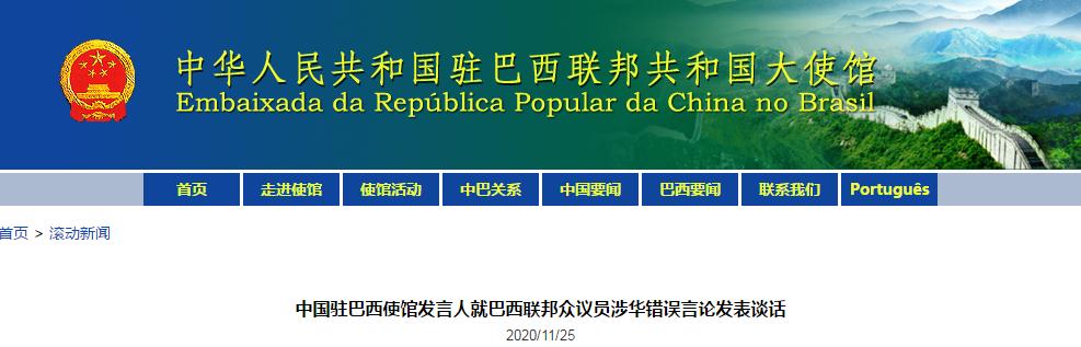25日,中國駐巴西使館發言人就巴西聯邦眾議員涉華錯誤言論發表談話,以下為全文: