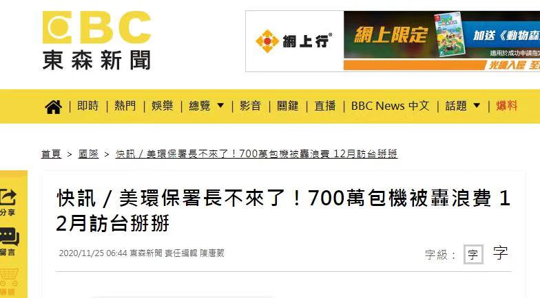 【環球網快訊】據台灣東森新聞雲剛剛消息,美國環保署長惠勒取消訪問台灣,原因是疫情期間必須包機訪問,費用高達25萬美元,被批評浪費公款。