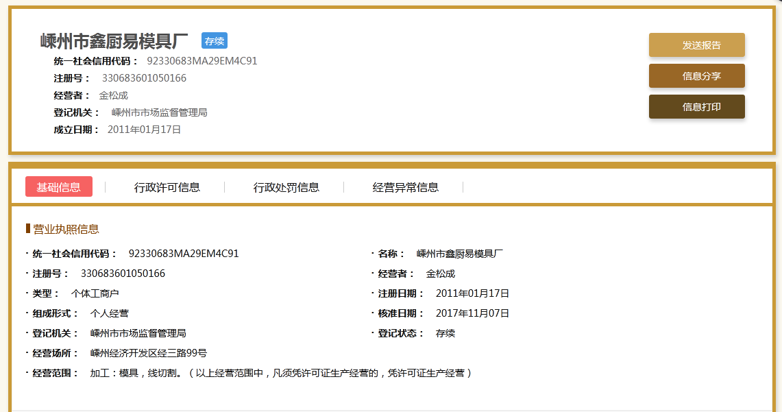 億田智能經銷商賠本幫公司刷業績,高管、主要員工則是忙着打理着自己的其他公司和業務。億田智能招股説明書披露,金松成是公司生產技術中心模具部經理,同時也是員工持股平台的有限合夥人。但工商資料顯示,金松成還經營嵊州市鑫廚易模具廠,擔任該廠的法定代表人。嵊州市鑫廚易模具廠的經營範圍與億田智能密切相關,金松成先生一面在公司任職,一面經營模具廠,億田智能是否允許?嵊州市鑫廚易模具廠又是否是億田智能的供應商,對此,招股書並未説明。